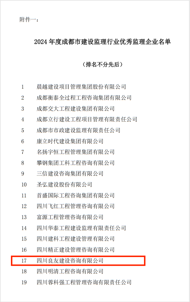 近日,成都市建設(shè)監(jiān)理協(xié)會公布了《2024年度成都建設(shè)監(jiān)理行業(yè)優(yōu)秀監(jiān)理企業(yè)名單》、《2024年度示范項目監(jiān)理機構(gòu)名單》以及《2024年度優(yōu)秀總監(jiān)名單》。我司連續(xù)第五年獲得“成都市建設(shè)監(jiān)理行業(yè)優(yōu)秀監(jiān)理企業(yè)”稱號。